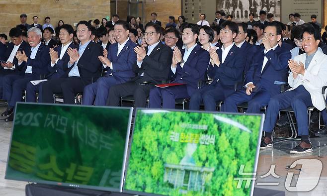 (서울=뉴스1) 안은나 기자 = 17일 오전 서울 여의도 국회 로텐더홀에서 열린 국회 탄소중립 선언식에서 참석자들이 손뼉치고 있다. 앞줄 왼쪽부터 서왕진 조국혁신당 원내대표, 이학영 부의장, 김병기 더불어민주당 대표 직무대행 겸 원내대표, 우원식 국회의장, 김용태 국민의힘 비상대책위원장, 한창민 사회민주당 대표, 주호영 부의장, 윤종오 진보당 원내대표. 2025.6.17/뉴스1