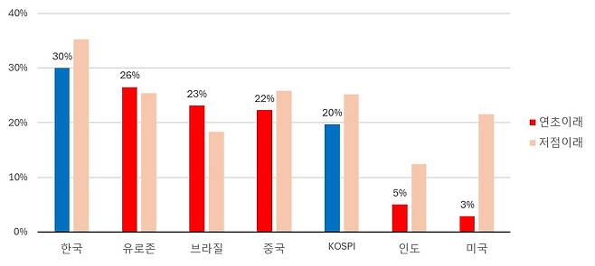 은 미국 상장 주식 ETF 수익률로 각국의 환율변동이 포함된 달러 기준 수익률이다(KOSPI는 원화 기준). 한국 주식시장이 연초 이래 30%, 올해 저점 이래 35% 올라 주요국 중 가장 높은 수익률을 기록했다.