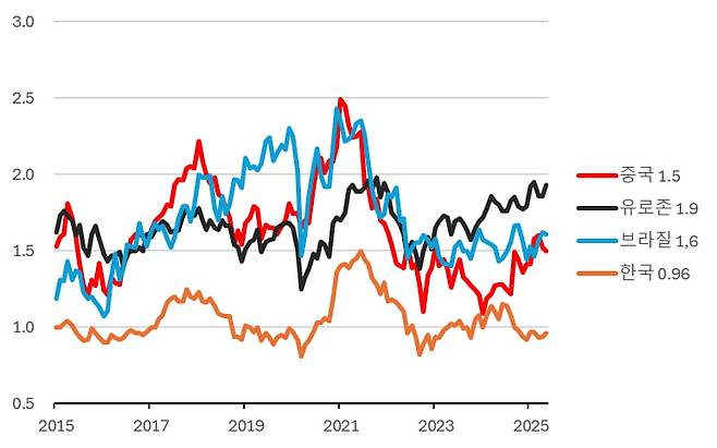 [표2]는 2015년 초 이래 주요 비미국 시장의 PBR 추이이며 한국 시장은 올해 5월 말 기준 0.96으로 주가가 재무제표상의 장부가에도 미치지 못하는 현실이다.