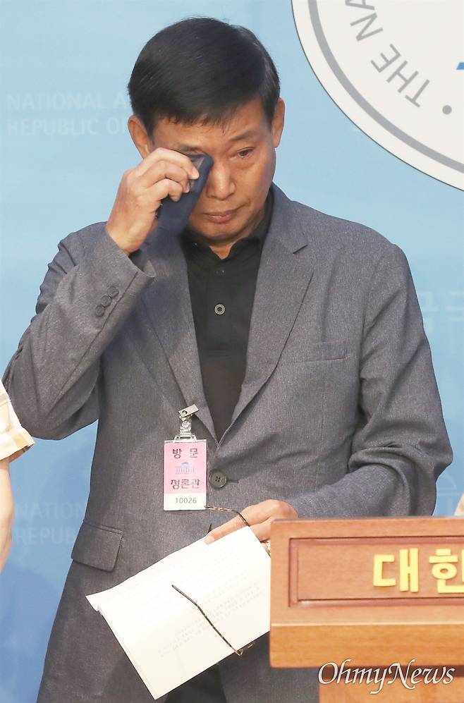 | ▲ 신원식 국방부장관 후보자의 중대장 시절 부대원이었던 조평훈씨가 지난 2023년 9월 27일 서울 여의도 국회 소통관에서 신 후보자에게 1985년 박격표 오발로 인한 '이일병 사망사건'에 대한 진실을 밝히라고 요구한 뒤 눈물을 훔치고 있다. |
