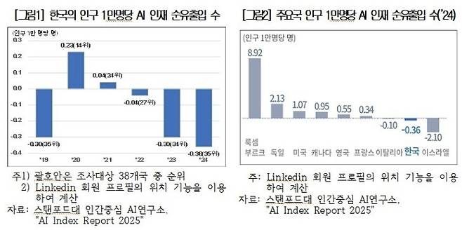 보고서에 따르면 지난해 기준 국내 인구 1만명당 인공지능(AI) 인재 순유출은 -0.36명으로, 경제협력개발기구(OECD) 38개국 중 35위를 기록했습니다.