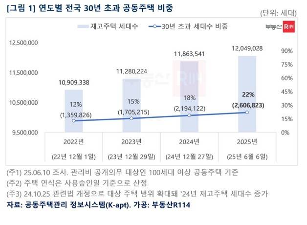 부동산R114가 공동주택관리 정보시스템(K-apt) 자료를 분석해 17일 공개한 결과에 따르면 지난 6일 기준 전국 공동 주택 중 노후주택 비중은 22%로 3년 전과 비교해 10%포인트 상승했다. 연도별로는 2022년 12월 12%, 2023년 12월 15%, 2024년 12월 18%로 매년 높아지는 추세다. 올해 주요 권역별 노후주택 비중은 수도권이 21%, 지방이 22%였고, 지방 5개광역시는 25%다. K-apt의 공동주택 기준은 2024년 10월 개정된 공동주택관리법 시행령에 따라 100가구 이상 관리비 공개 의무가 있는 아파트, 연립, 다세대에 해당된다.