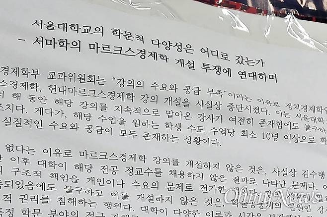 | ▲ 16일 오후 서울대 관악캠퍼스에 마르크스경제학 강의·강사 채용 배제를 비판하는 대자보가 붙어 있다. |