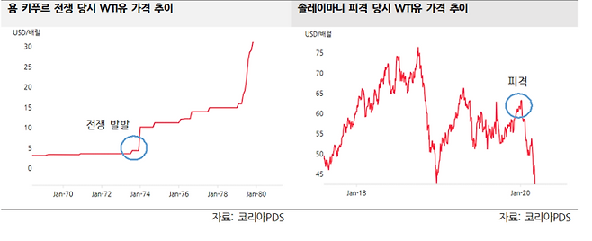 반면 공급 차질로 발전한 사례에서는 유가가 크게 뛰었다. 그중 상승폭이 가장 컸던 사례는 1973년 10월 욤 키푸르 전쟁이었다. 당시 최대 400만배럴의 생산 차질이 발생하면서 유가는 최대 135% 상승했다.