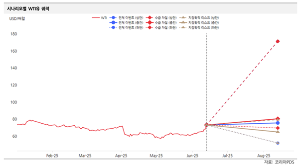 만일 실제 공급 차질이 발생할 때 현지 시간 6월 13일 기준 72.98달러의 WTI가 최대 약 135% 상승해 배럴당 171달러까지 치솟을 수 있으며, 공급 차질이 발생하지 않고 지정학적 우려만 지속된다면 유가는 52달러까지 하락할 수 있다고 예측했다.
