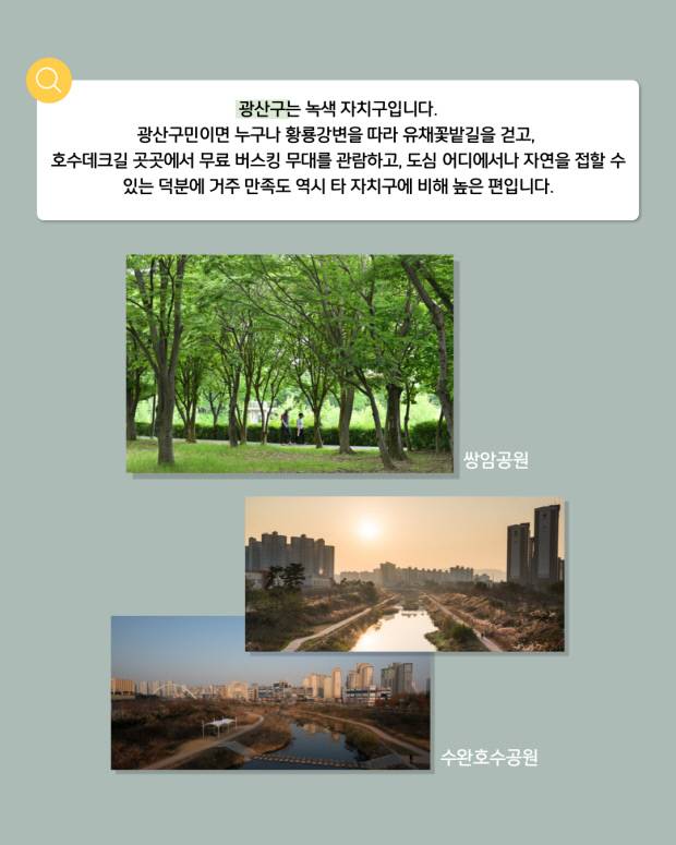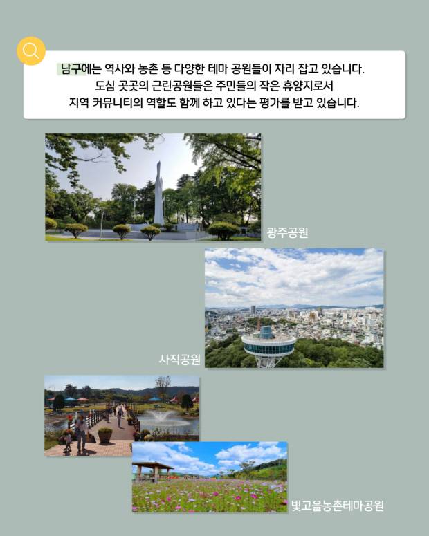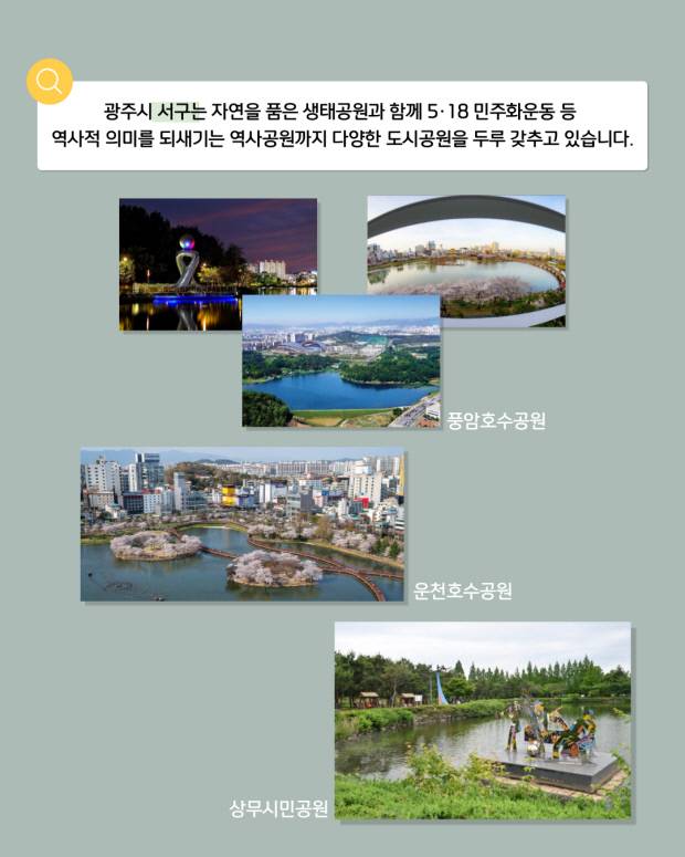 광주시는 ‘2045 탄소중립 에너지 자립 도시’를 선언하고, 대중교통 ·자전거·보행자 중심의 ‘대·자·보 도시’ 정책과 함께 시민 누구나 공원 속 삶을 누릴 수 있는 ‘녹색 도시’ 만들기에 집중하고 있습니다.
