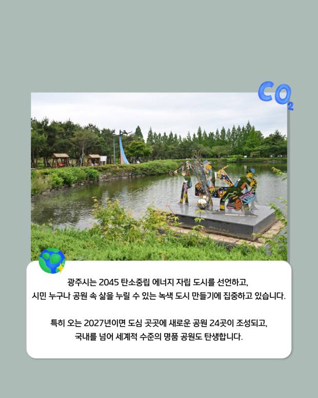 광주시는 '2045 탄소중립 에너지 자립 도시'를 선언하고, 대중교통 ·자전거·보행자 중심의 '대·자·보 도시' 정책과 함께 시민 누구나 공원 속 삶을 누릴 수 있는 '녹색 도시' 만들기에 집중하고 있습니다.