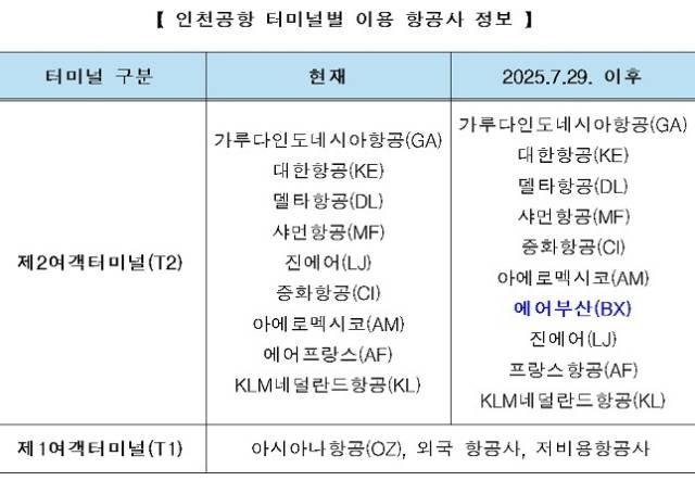 현재 인천공항 제2여객터미널(T2)에는 대한항공 진에어 델타항공 에어프랑스 KLM네덜란드항공 등 9개 항공사가 운항 중이며, 7월 29일부터는 에어부산이 추가돼 총 10개 항공사가 운항하게 된다.