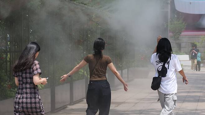 ▲ 낮 기온이 30도를 웃돌며 후텁지근한 날씨가 계속된 17일 서울 중구 서울시청 앞 서울광장에 설치된 쿨링포그가 가동되고 있다.