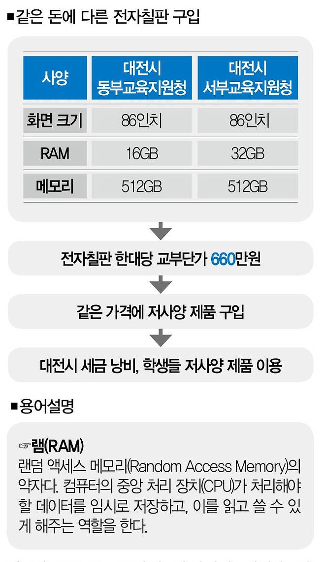 그 결과, 동부교육지원청은 86인치, 램 16GB, 메모리 512GB 제품을 547만원에 구매했다. 서부교육지원청은 86인치, 램 32GB, 메모리 512GB인 전자칠판을 556만원에 구입했다. 설치비 등 부대비용을 포함하면 두대엔 각각 660만원의 예산이 쓰였다. 문제는 같은 비용으로 전자칠판을 구입했는데도 동부교육지원청의 제품 사양(램 16GB)이 서부교육지원청(램 32GB)보다 낮다는 점이다.