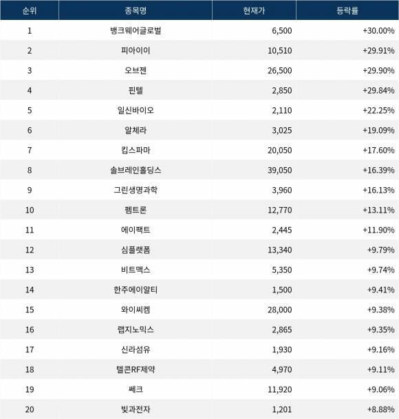 6위 알체라(347860)는 종가 3,025원으로 19.09% 급등 마감했다. 7위 킵스파마(256940)는 종가 20,050원으로 17.60% 급등 마감했다. 8위 솔브레인홀딩스(036830)는 종가 39,050원으로 16.39% 급등 마감했다. 9위 그린생명과학(114450)은 종가 3,960원으로 16.13% 급등 마감했다. 10위 펨트론(168360)은 종가 12,770원으로 13.11% 급등 마감했다.