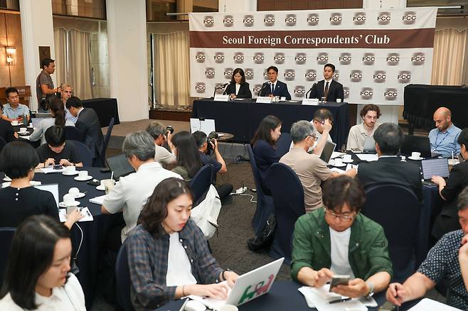 김민석 국무총리 후보자가 17일 서울 중구 프레스센터에서 열린 외신기자간담회에서 모두발언을 하고 있다.