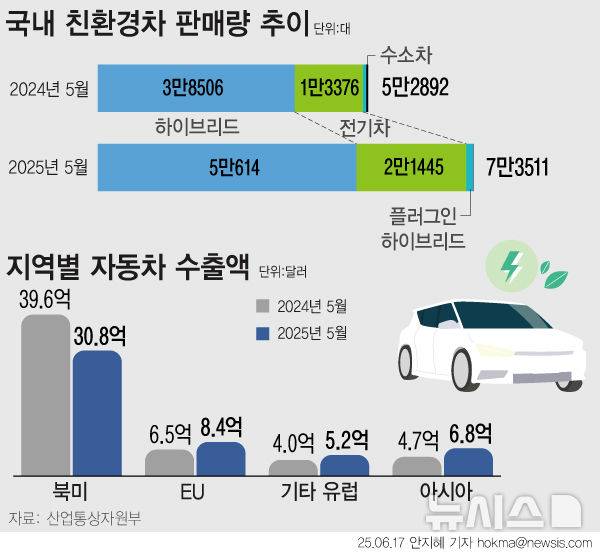 [서울=뉴시스] 지난달 친환경차 내수 판매가 사상 처음 7만대를 돌파하며, 역대 최초로 내연차 판매량을 추월한 것으로 나타났다. 5월 친환경차 판매량은 1년 전과 비교해 39.0% 늘었다. 점유율만 따져봐도 내수판매에서 52%를 차지하는 것으로 확인됐다. 미국 관세 부과 조치로 인해 대미 자동차 수출은 27.1% 감소했다. 지난해 호조로 인한 기저효과도 작용한 것으로 풀이된다. (그래픽=안지혜 기자)
