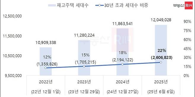 전국 노후 주택 비율은 지난해 12월 말 18%(219만4122가구)에서 약 6개월 만에 4%포인트 상승했다. 3년 전인 2022년 말보다는 10%포인트 올랐다.