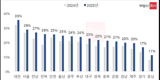 지역별로 대전이 35%로 노후 주택 비중이 가장 컸다. 이어 서울(29%), 전남(27%), 전북(26%), 인천·울산(각 25%) 순이었다.
