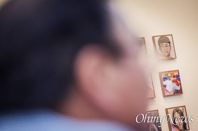 | ▲ 아버지 김순신씨 너머로 아들 고 김정훈씨의 사진이 걸려 있다. |