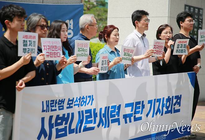 사태 반복을 막으려면 '즉각적인 처벌'만이 해법이라고 본 양 사무처장은 "추가 기소는 물론 윤석열까지 바로 구속하는 게 필요하다. 그게 안 된다면 검찰과 법원 모두 내란 사태를 해소할 자정 기능이 없다는 의미"라고 목청을 키웠다. 이날 그는 '지귀연 판사 규탄' 손팻말을 들고 나섰다.