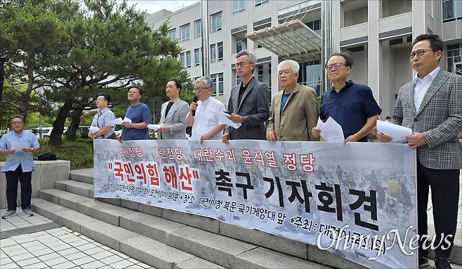 대전시국회의는 17일 대전시청 북문 앞에서 기자회견을 열고 "불법 계엄을 통한 내란, 친위 쿠데타는 국민의 헌신으로 막아냈지만 아직 내란이 종식된 것은 아니"라며 "내란 청산의 첫걸음은 국민의힘 해산"이라고 주장했다.
