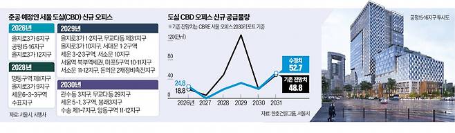 내년 공급이 가능한 사업은 을지로3가 6지구, 공평15·16지구, 을지로3가 12지구 등 3곳이다. 2027년은 없고, 2028년은 명동구역 제1지구 재개발, 을지로3가 9지구, 세운6-3-3구역, 수표지구 등 4곳이다. 2029년에는 을지로3가 1·2지구, 마포5구역 10·11지구, 돈의문 2재정비촉진지구 등 10곳이 준공할 것으로 예상된다. 2030년은 관수동 3지구(서울극장), 무교다동 29지구 등 6곳으로 다시 줄어든다. 업계 관계자는 “자본조달 측면에서 볼 때 초대형 오피스는 용적률이 1000% 이상이고, 3.3㎡당 공사비와 토지비 등을 합친 원가가 3500만원 이하여야 경쟁력이 있을 것”이라며 “토지 조달비가 낮은 개발사업이 유리할 것”이라고 했다.