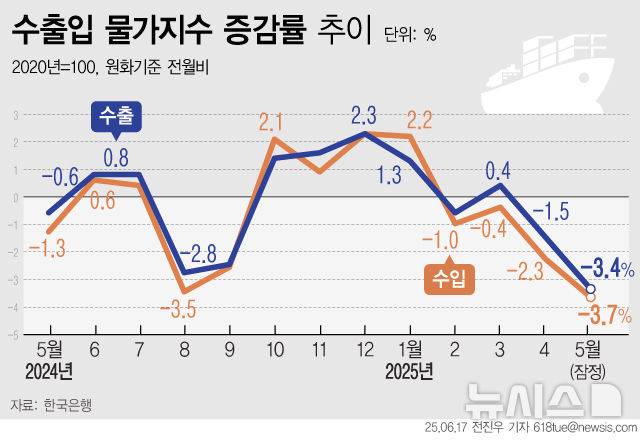 [서울=뉴시스] 17일 한국은행에 따르면 지난달 수입물가는 134.63(2020=100)으로 전월 대비 3.7% 떨어졌다. 4개월 연속 하락으로 2023년 11월 이후 최대 낙폭이다. 수출물가는 128.56으로 전월 대비 3.4% 떨어져 두달 째 하락세를 이어갔다. 이 역시 지난 2023년 11월 이후 최대 낙폭이다. (그래픽=전진우 기자)