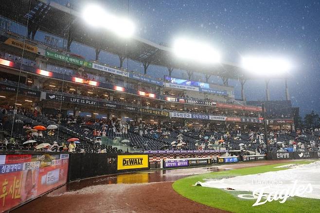 지난 15일 대전 LG-한화전 경기 도중 많은 비가 내렸다.