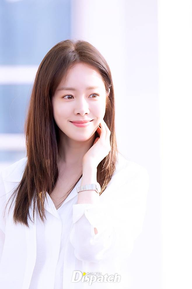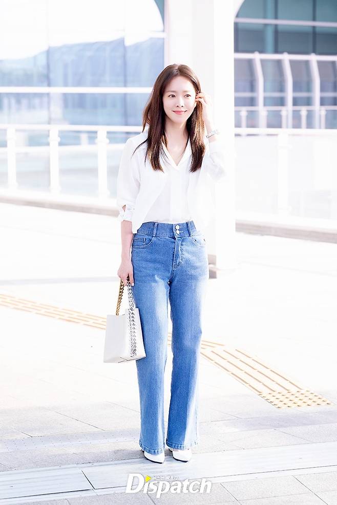 한지민은 데님 팬츠에 화이트 블라우스로 청순한 공항패션을 연출했다. 러블리한 매력이 돋보였다.