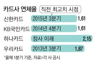 올해 1분기 말 기준으로 하나카드 연체율은 2.15%로 회사가 출범한 2014년 12월 이래 최고 수준으로 치솟았다. 우리카드는 2013년 3분기, KB국민카드는 2014년 4분기, 신한카드는 2015년 3분기에 최고치를 기록한 이후 10여 년 만에 최악의 연체율을 보이고 있다.