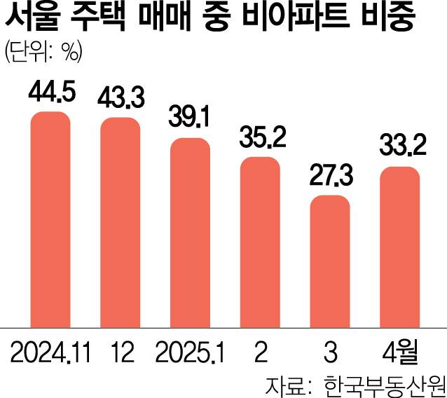 비아파트는 단독주택·다가구주택·다세대주택·연립주택 등 아파트를 제외한 주택이다. 비아파트의 약 90%가 다세대주택과 연립주택 등을 포함한 빌라다. 서울 비아파트 매매 비중은 지난해 11월(44.5%)부터 올해 3월(27.3%)까지 하락세를 보인 후 4월에 5개월 만에 증가세로 돌아섰다.
