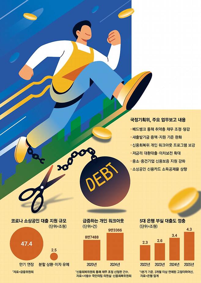 현재 취약계층 빚을 덜어주기 위한 정책 창구로는 캠코가 주도하는 새출발기금과 신복위의 개인 워크아웃 제도가 있다. 새출발기금은 최대 15억원까지 채무를 조정해주는 제도다. 개인 워크아웃은 3개월 이상 연체된 사업자를 대상으로 최장 8년간 분할 상환, 이자 전액 감면을 지원하는 프로그램이다. 정부는 그동안 두 제도의 실효성이 크지 않았다고 보고 이를 보강하기로 했다. 지원받을 수 있는 기준을 대폭 낮추는 방안이 거론된다. 캠코는 새출발기금을 통해 2022~2025년까지 30조원 규모로 부실 채권 등을 매입하려고 했지만 채무 조정 금액은 단 5조8000억원(4월 기준)에 그친다. 개인 워크아웃도 소상공인 재기 지원 강도가 강하지 않다는 평가다.