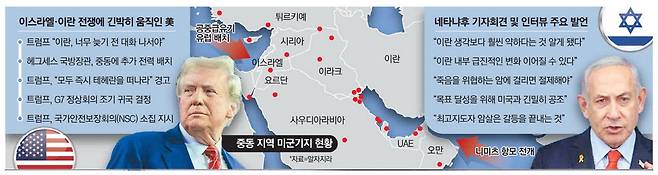 브레이크 없는 극한 충돌 양상을 보이고 있는 이스라엘·이란 전쟁의 해결을 두고 미국에 결단의 순간이 다가오고 있다. 도널드 트럼프 미국 대통령이 적극적 중재자로 외교적 노력을 확대할지, 아니면 베냐민 네타냐후 이스라엘 총리에 대한 지지를 강화하며 이란의 정권 교체(레짐 체인지)까지 모색하는 선택을 할지 전 세계가 숨죽이며 지켜보고 있다.