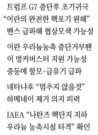 트럼프 대통령은 16일(현지시간) 캐나다에서 주요 7개국(G7) 정상회의 첫날 일정을 소화하다 급거 미국 워싱턴으로 돌아왔다. 미국 CBS 보도에 따르면 트럼프 대통령은 귀국길에서 "이란이 핵무기를 '완전히 포기'하고 이란 핵 문제가 '진정으로 종식'되기를 바란다"고 말했다. 이어 "스티브 위트코프 중동특사나 J D 밴스 부통령을 이란에 파견할 수도 있다"고 전했다.