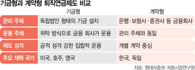 기금형 퇴직연금 제도는 현재의 계약형 퇴직연금 제도에서 수익률이 부진하다는 점이 지적을 받으며 도입 논의가 급물살을 탔다. 국민연금처럼 외부의 독립된 기금이 퇴직연금을 운용·관리하도록 해 원리금 보장형으로 쏠려 있는 현행 제도의 문제를 바로잡고 수익률을 높이자는 취지다.