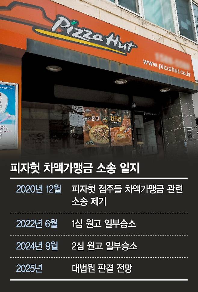 피자헛 가맹점주 90여명은 지난 2020년 본사가 점주들과 '합의하지 않고' 원부자재에 마진을 붙여 판 것은 부당하다며 차액가맹금을 돌려달라는 취지의 손해배상 소송을 냈다. 1심과 2심 법원은 점주들의 손을 들어줬다. 차액가맹금을 '부당이득'이라고 보고 점주들에게 210억원 가량을 배상하라고 판단했다. 한국피자헛은 지난해 9월 항소심 판결에 불복해 대법원에 상고했다. 업계는 이르면 올해, 늦어도 내년에는 대법원 판결이 나올 것으로 보고 있다.