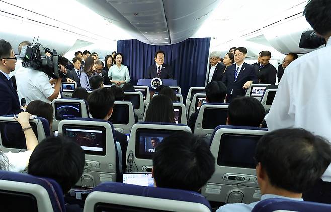 | ▲ 이재명 대통령이 16일(현지시간) 주요 7개국(G7) 정상회의 참석을 위해 캐나다 앨버타주 캘거리로 향하며 공군 1호기에서 김혜경 여사와 함께 기자간담회에 참석해 발언하고 있다. |