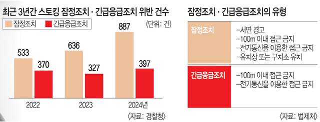 17일 국민일보가 입수한 경찰청 자료에 따르면 지난해 스토킹 가해자의 접근금지 등 잠정조치 위반은 887건으로 전년(636건) 대비 39% 늘었다. 2022년(533건)부터 2년 연속 증가세다. 긴급응급조치 위반은 지난해 기준 397건으로 전년(327건)보다 17% 늘었다.