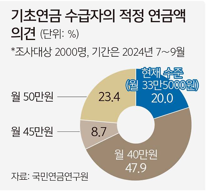 17일 국민연금연구원 ‘2024년 기초연금 수급자 실태분석’ 보고서에 따르면 지난해 7∼9월 기초연금을 수급하는 만 65세 이상 노인 2000명 대상으로 기초연금의 적정 수준을 물은 결과 ‘월 40만원’ 응답률이 47.8%로 가장 높게 나타났다.