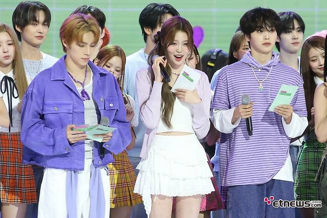 웨이션브이 샤오쥔, 이즈나 세비, 크래비티 형준이 10일 서울 상암동 SBS프리즘타워에서 진행된SBS funE ‘더 쇼’ 현장 미디어 공개 일정에 참석해 MC를 보고 있다.