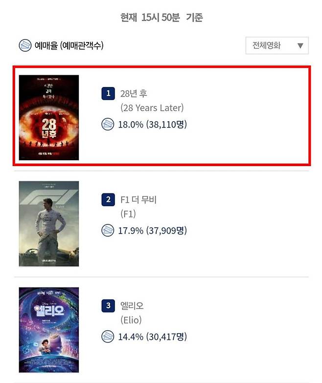 17일, 영화관입장권 통합전산망에 따르면 영화 '28년 후'가 오늘(17일) 오후(오후 7시 기준) 전체 예매율 1위(19%)를 질주 중이다. 현재 박스오피스 1위를 두고 치열한 경쟁을 펼치고 있는 '드래곤 길들이기'(7.7%)와 '하이파이프'(5.9%)는 물론 개봉 전부터 기대를 모으고 있는 '엘리오'(15.1%)와 'F1 더 무비'(18.2%) 등의 경쟁작들 사이에서 '28년 후'는 화제성을 입증하며 팬들을 더 기대하게 했다.