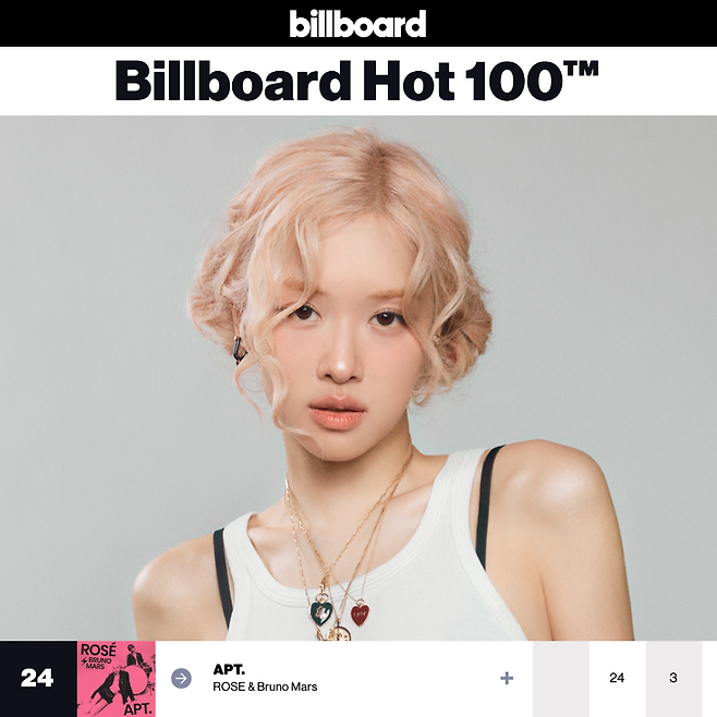 빌보드는 17일(한국시간) 최신차트 순위를 공개했다. 로제의 정규 1집 '로지(ROSIE) 선공개곡 '아파트'(APT.)가 메인 싱글 차트 '핫 100' 24위에 올랐다.