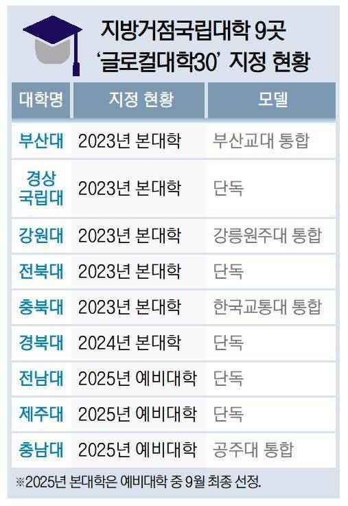 교육부는 오는 9월 ‘글로컬대학30’ 사업의 지정 대학 30곳 중 마지막 10곳을 최종 선정한다. 지난달 27일 ‘예선 통과’격인 예비 지정 대학 25곳이 발표됐는데 지거국인 전남대·제주대·충남대가 포함됐다. 이에 따라 지거국 9곳 모두가 글로컬대학30 지정 대학이 될 가능성이 높아졌다. 이미 6곳의 지거국은 최종 선정된 상태다. 2023년에는 부산대(부산교대 통합), 강원대(강릉원주대 통합), 충북대(한국교통대 통합), 경상국립대, 전북대가 선정됐으며, 2024년에는 경북대가 추가됐다.