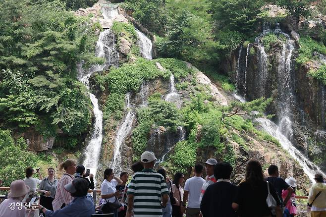 서울 낮 기온이 30도 안팎으로 오르며 무더운 날씨를 보인 17일 서울 서대문구 홍제폭포 앞에서 시민들이 휴식을 취하고 있다.