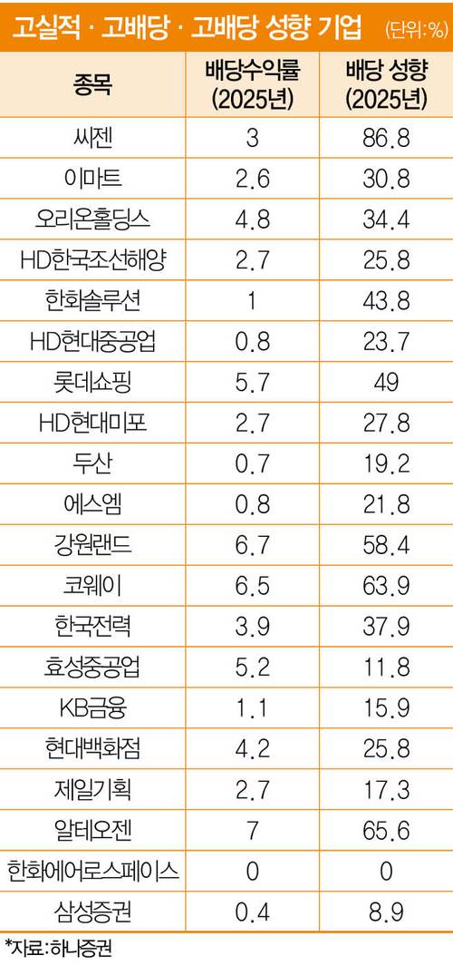 이 대통령이 내세운 다양한 증시 부양책 중 단연 눈에 띄는 방안이 배당 촉진이다. 주주가 기업 주인으로서 배당으로 수익 내는, 투자 본질에 다가서겠다는 계획을 언급했다. 이 대통령이 배당 증대를 위한 세제·제도 개편을 언급하며 배당 성향이 높은 기업에 관심이 쏠린다.