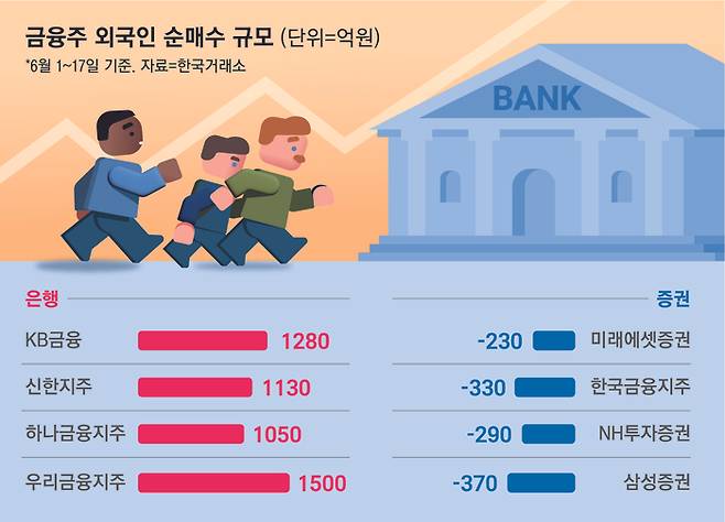 같은 기간 외국인들은 신한지주를 1130억원어치 순매수했다. 당장 지난달에도 매도 우위를 나타내며 올해 들어 5월까지 6000억원어치 신한지주 주식을 팔아치우던 외국인들이 ‘사자세’로 전환했다. 지난달 57%까지 떨어졌던 외국인 지분율도 59%에 근접하고 있다.