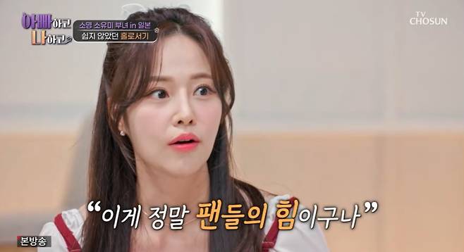 17일 방송된 TV조선 '아빠하고 나하고'에서는 트로트 가수 소명이 트로트 가수이자 딸 소유미의 ‘홍보 요정’을 자처한다. 소유미는 아빠의 그늘에서 벗어나 홀로서기를 위해 일본에서 단독 콘서트를 준비했다.
