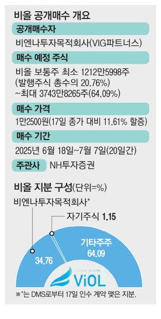 이후 VIG는 비올 자기주식 67만6185주(1.15%)를 제외한 잔여 지분 전량을 공개매수하기로 했다. 공개매수 대상 주식은 최소 1212만5998주(20.76%)~최대 3743만8265주(64.09%)다.