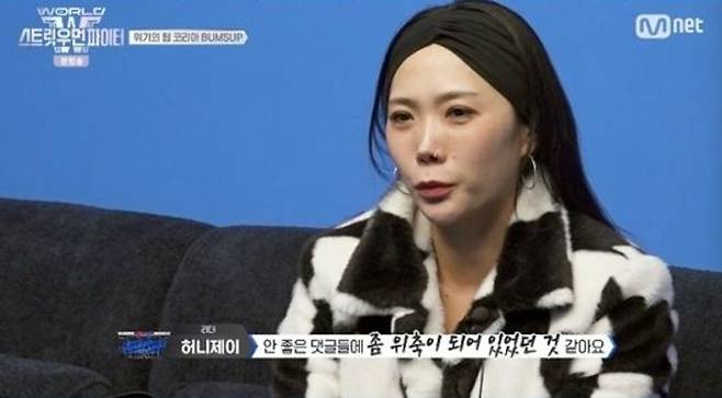 17일 밤 Mnet '월드 오브 스트릿 우먼 파이터'(이하 월드 오브 스우파)에선 한국팀 '범접(BUMSUP)' 멤버들이 케이팝 미션 무대 공개 후 쏟아진 혹평에 대한 생각을 드러내는 장면이 전파를 탔다. 허니제이는 "첫 배틀 때 저도 너무 아쉬웠다. 안 좋은 댓글에 위축이 되는 것 같았다"라고 고백했다.