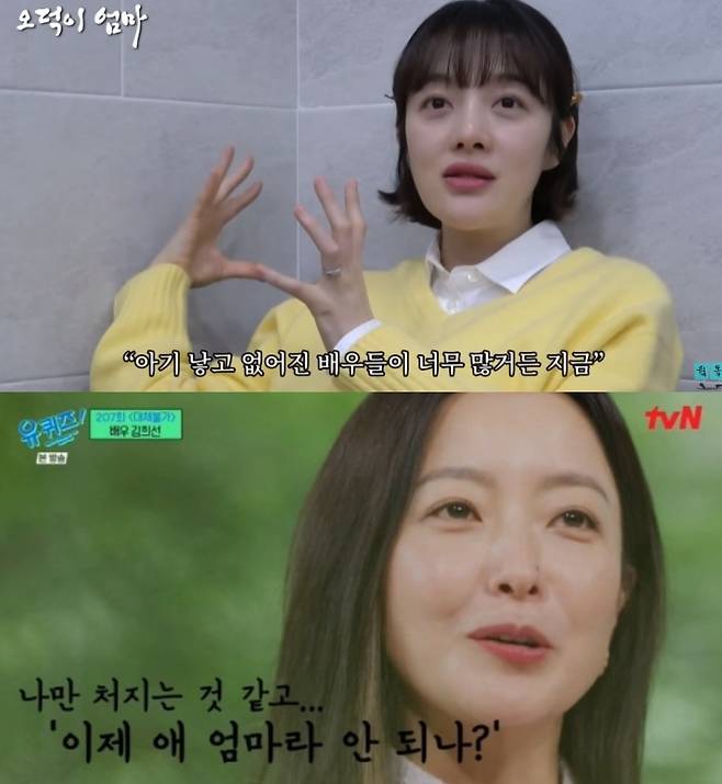 tvN '유 퀴즈 온 더 블럭'에 출연한 김희선도 결혼을 한 뒤 아이를 낳고 6년 정도를 쉬었다며 "아이를 안고 아이한테 젖병을 물리면서 저랑 같이 활동했던 배우들이 너무 좋은 작품을 다 하고 있더라. 나만 처지는 것 같고 '이제 애 엄마랑 안 되나?' 이러면서 그때는 혼자 많이 괴로워했다"고 당시의 심경을 털어놨다.