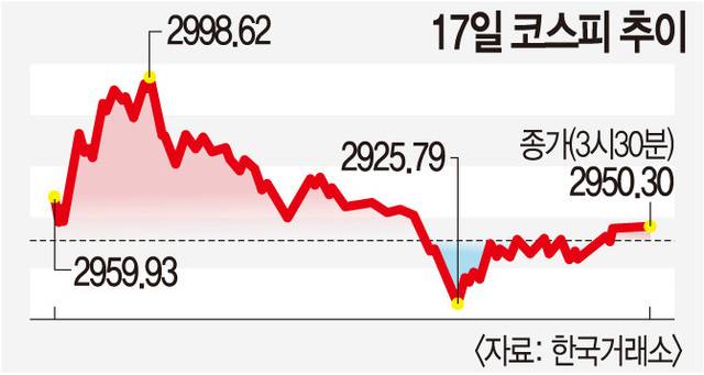 코스피는 17일 오전 한때 2998.62까지 오르며 3000선에 불과 1.38 포인트 차이로 근접했지만 중동발 지정학적 불안이 커지면서 오후 들어 상승분을 대부분 반납, 강보합으로 마감했다.