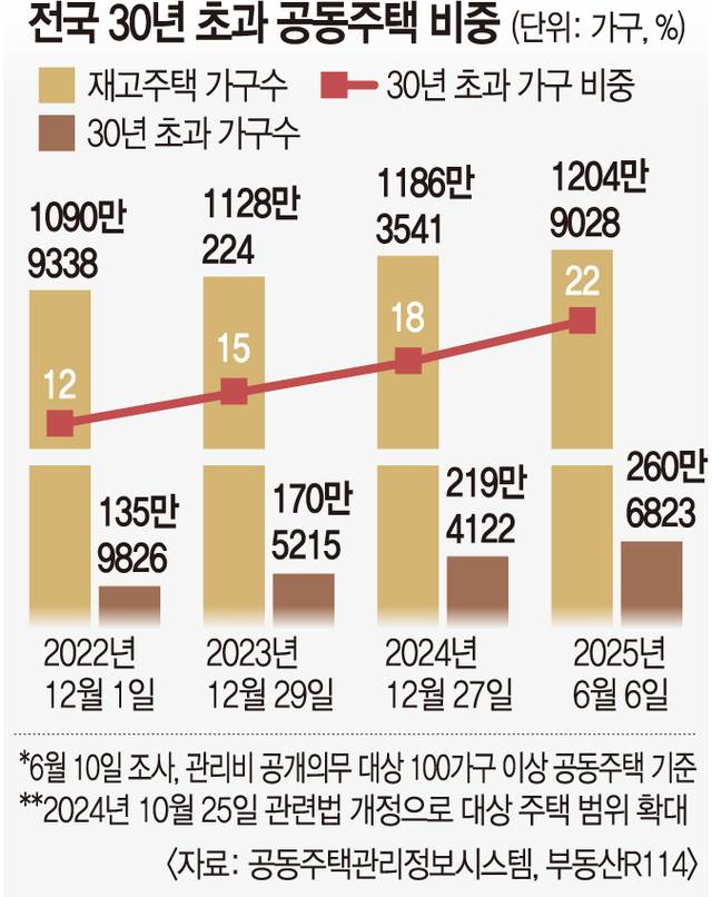 17일 부동산R114에 따르면 전국의 30년 초과 노후주택은 22%(260만6823가구)로 조사됐다. 공동주택관리정보시스템(K-apt)의 지난 6일 기준 자료를 분석한 결과다. 2022년 12월 1일(12%) 이후 2년6개월 만에 10% 포인트 상승했는데, 지난해 12월 말(18%)과 비교해도 6개월 만에 4% 포인트 올랐다. 확산세가 가파르다.