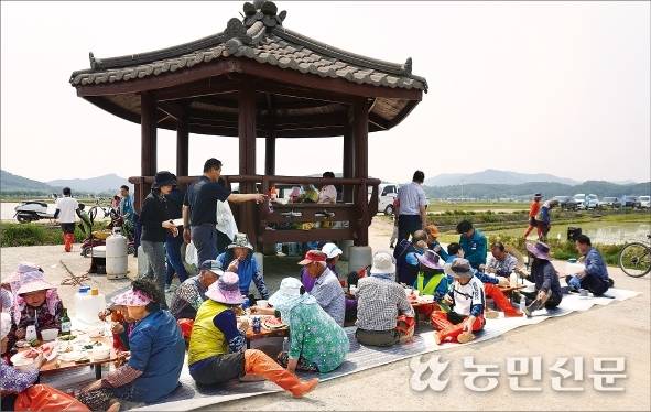 5월30일 전남 영암군 학산면에서 손모내기 행사를 마친 농민들이 새참을 들며 더위를 식히고 있다.